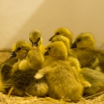 Pfingstsonntag sind bei Marc die ersten Gänseküken geschlüpft. Die Eier haben ca. vier Wochen im Brüter gelegen. Direkt nach dem Schlüpfen mußten sie noch ein paar Stunden im Brüter bei höherer Luftfeuchtigkeit bleiben. Danach kamen sie erstmal unter Aufsicht in der Werkstatt in einem Kasten mit Wärmelampe. Unter der Lampe gab’s von Tag zu Tag größeres Gedränge, einfach weil sie unvorstellbar schnell wachsen. Das Gewusel wurde nur zum Fressen kurz verlassen. Mittlerweile sind sie groß genug, um mit den anderen auf der Wiese rumlaufen zu dürfen.