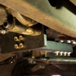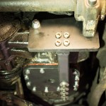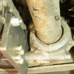 Der Lagerbock mit dem Gummilager hatte genügend Reserve zum Abfräsen der Schraubensitze. Hierdurch konnte genügend Platz für eine mit mehrfacher Sicherheit ausreichende Halteplatte in 15mm Stärke geschaffen werden. Die Halteplatte wurde am Lagerbock mit Schrauben im Originalquerschnitt befestigt. Die untere Schraube im Lagerbock hält jetzt nicht mehr das Getriebegehäuse direkt, sondern ist in ein Gewinde in der neuen Halteplatte eingedreht. Die Obere Schraube im Lagerbock sitzt weiterhin am Getriebegehäuse, verläuft aber durch eine Bohrung in der Halteplatte. Der dritte Befestigungspunkt zwischen Halteplatte und Getriebegehäuse nutzt das bislang ungenutzte Loch. Alle verwendeten Schrauben haben die Festigkeitsklasse 12.9. Zur zusätzlichen Stabilisierung wurde auf dem unteren Deckel des Getriebes eine weitere Platte in 15 mm Stärke aufgedoppelt und die Schrauben zur Befestigung des Getriebedeckel durch entsprechend längere ersetzt. Zwischen dieser zusätzlichen Platte und der Halteplatte am Lagerbock wurde eine Tragstrebe eingesetzt, die mit Hülsen verschraubt wurde. Zur Befestigung an der Halteplatte dient ein massiver Block mit vier Gewindebohrungen an der Stirnseite der Strebe. Um einen spannungsfreien Einbau zu gewährleisten, wurden die Strebe und der Block mit den Bohrungen zunächst montiert und erst in der endgültigen Einbaulage geheftet. Die Schweißverbindung zwischen Strebe und Block ist mit zusätzlicher Decklage WIG-geschweißt.